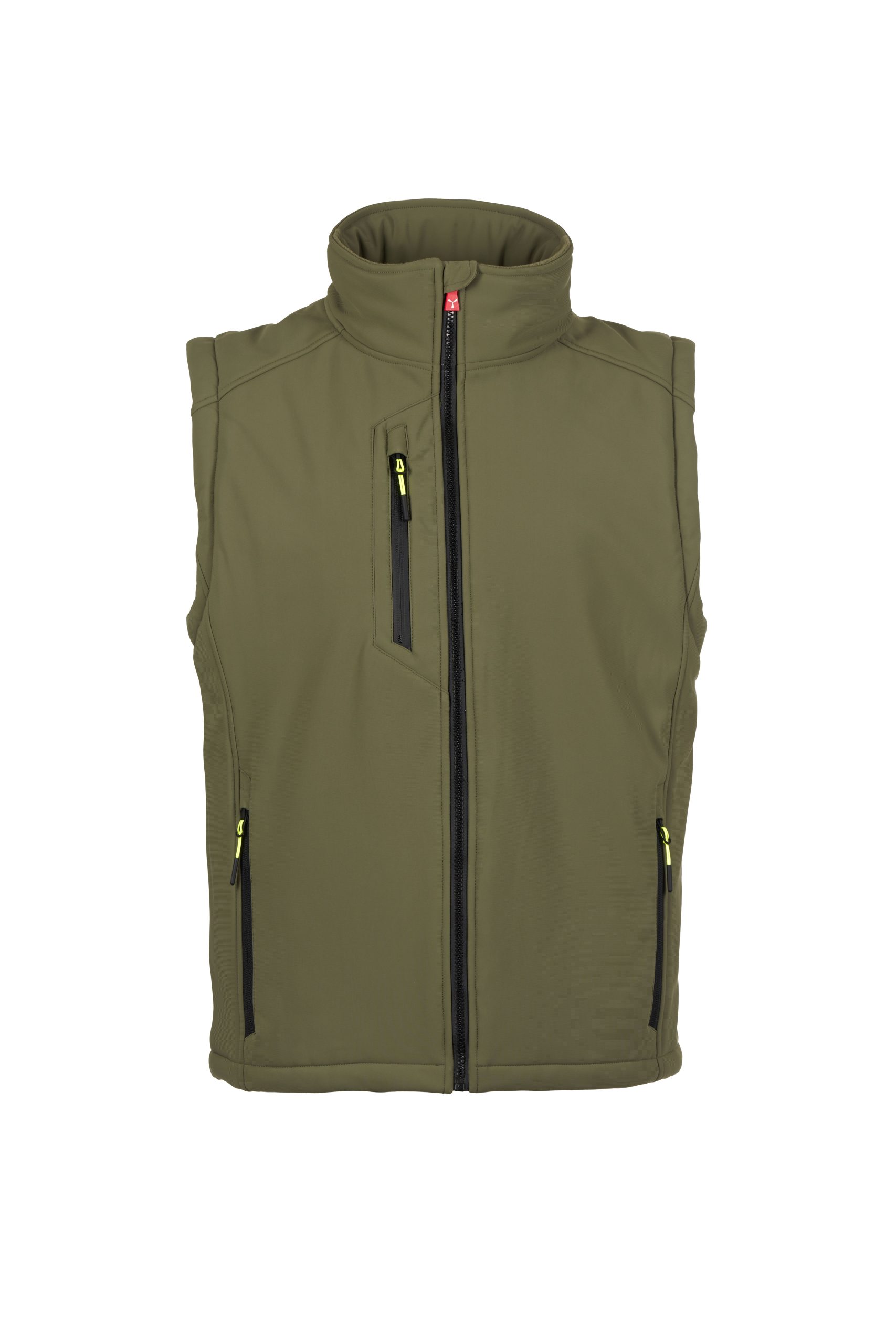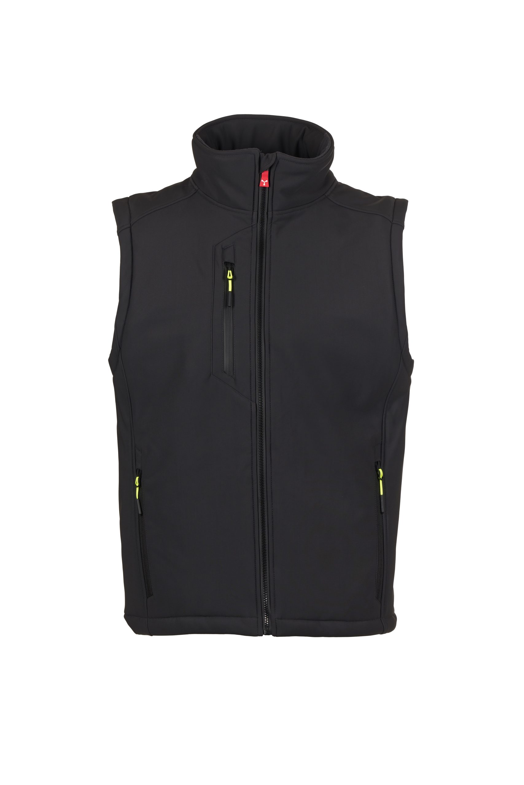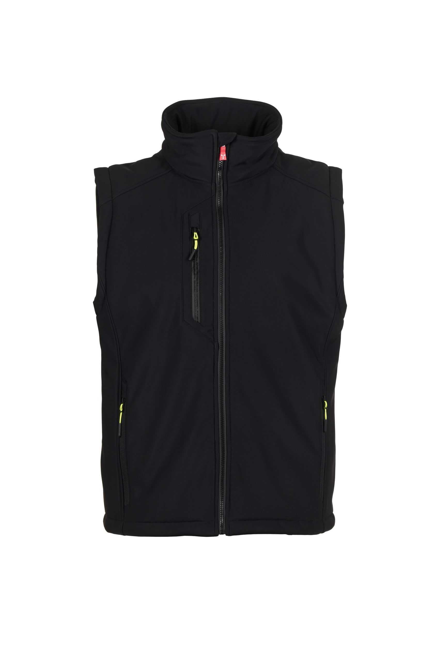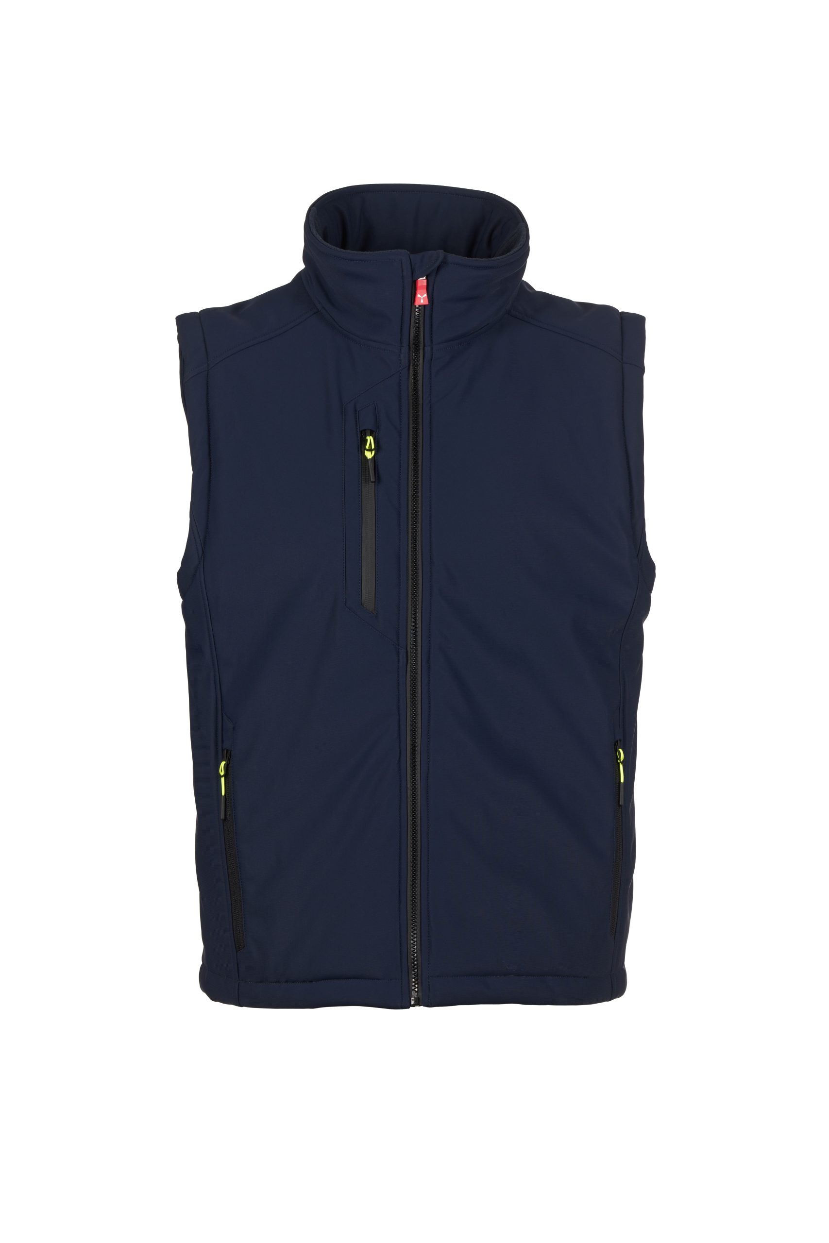 2 Seitentaschen mit Reißverschluss, 1 Brusttasche mit beschichtetem Reißverschluss. Fluoreszierende Schiebergriffe.