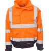 Zweifarbige Warnschutzjacke, Reflexstreifen, durchgehender, verdeckter Reißverschluss, im Kragen einrollbare Kapuze, elastische Taille